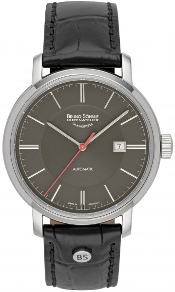 Automatikuhr mit grauem Zifferblatt, Datumsanzeige und Zentralsekunde.