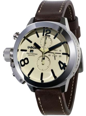 Vor allem die U-Boat Classico 50 (Ref. 7433/A), deren Name auf die 50 Millimeter Gehäusedurchmesser anspielt, entlastet das Auge maximal: Schwarze Zeiger und Ziffern, von denen markentypisch nur die “4”, “8” und “12” in arabischer Form erscheinen, sorgen auf beigem Grund für einen Kontrast, wie er deutlicher nicht sein könnte. Fast unbemerkt ist eine Chronographenfunktion in den 100 Meter wasserdichten Boliden integriert, dessen Drücker und Krone auf der linken Seite angebracht sind.